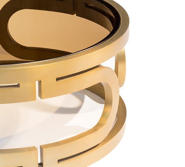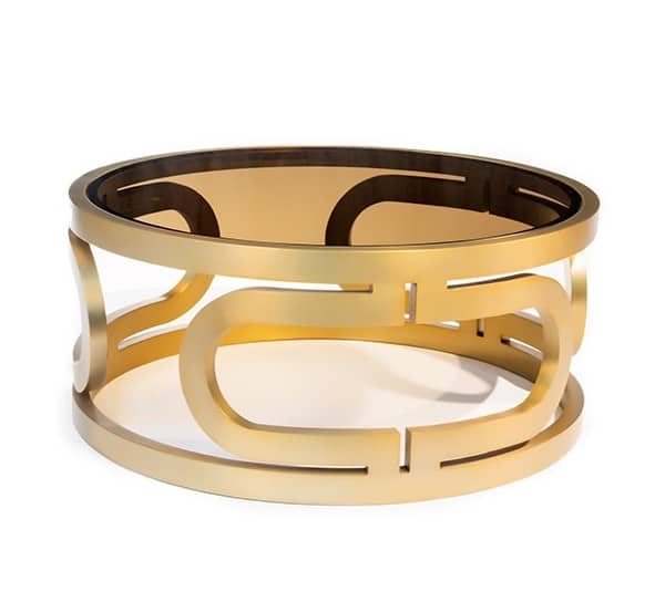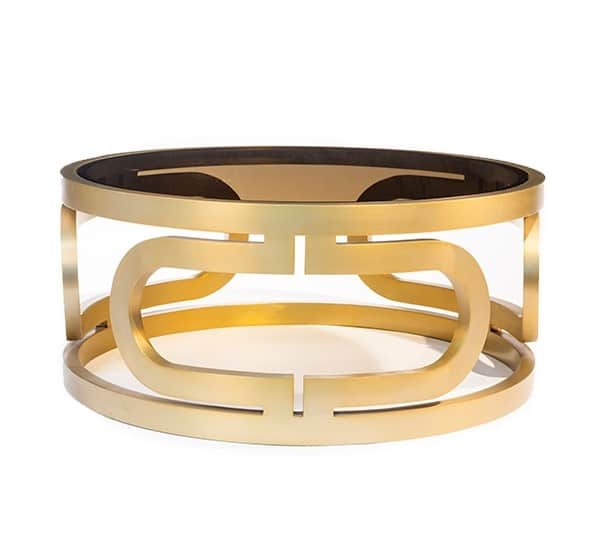 For a divine dose of contemporary excellence, add this circular table to your living space! The stunning Gold Matt base features an interlocking design.… The airy frame makes this perfect for smaller living rooms and the brown tinted glass top blends with a variety of decor styles. The abstract style and round shape of this center table evokes art deco appeal your guests will love